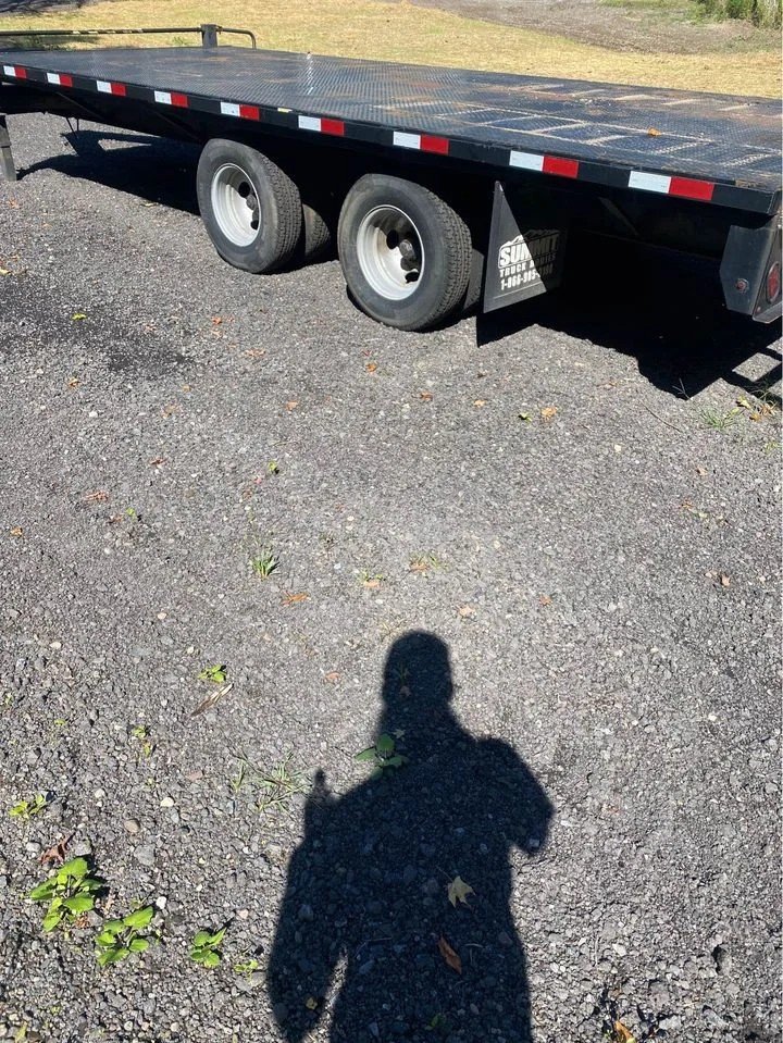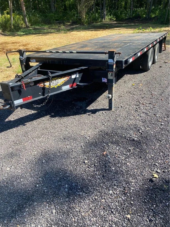 This heavy-duty trailer is built for hauling equipment with ease and safety. Rated at 23,000 lb GVW, it includes a 20′ treated wood deck with a 5′ dovetail, fold-up ramps, and dual axles with electric brakes.
